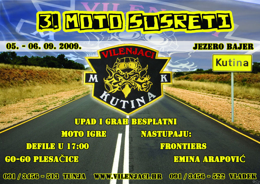 Ove godine Moto klub Vilenjaci iz Kutine obilježava 3. godinu postojanja i tim povodom se tradicionalno održava moto susret na Jezeru Bajer u Kutini u subotu 5. rujna 2009. godine.Uz pregršt prekrasnih motora, biti će tu moto igara i puno zabave kako za same bikere tako i za posjetitelje. Svečana povorka motora kreće u 17 sati sa samoga jezera, a prostirati će se diljem ulica cijeloga Grada Kutine. Cjelodnevnu užarenu atmosferu dodatno će, u večernjim satima, zapaliti Emina Arapović, a sve to popratiti će i go – go plesačice kojima nećete moći odoljeti.