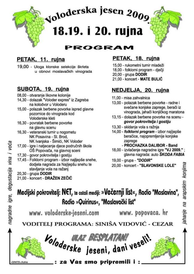 Naravno, i ove godine priređuje se bogat kulturno-umjetnički program, sajam vina i mošta. Nastupat će mnoge folklorne skupine iz cijele Hrvatske, bit će postavljene izložbe slika, pribora i alata za vinogradarstvo i voćarstvo. Moći će se vidjeti razne rukotvorine, narodne nošnje i tradicionalni zanati. Večernji sati bit će u znaku estradnih pjevača, a završetak manifestacije planira se obilježiti velikim vatrometom.