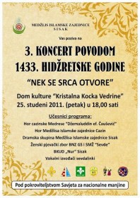 Medžlis Islamske zajednice Sisak organizira 3. koncert povodom 1433. Hidžretske godine pod nazivom “Nek se srca otvore”. Koncert će se održati u Domu kulture Kristalna kocka vedrine u petak, 25. studenog, od 18 sati, a sudjeluju: Hor cazinske Medrese “Džemaluddin ef. Čaušević”, hor Medžlisa Islamske zajednice Cazin, Dramska skupina Islamske zajednice Sisak, Ženski pjevački zbor Bošnjačke nacionalne zajednice Grada Siska i Sisačko moslavačke županije “Sevde”, BKUD Nur iz Siska te vokalni izvođači sevdalinki.