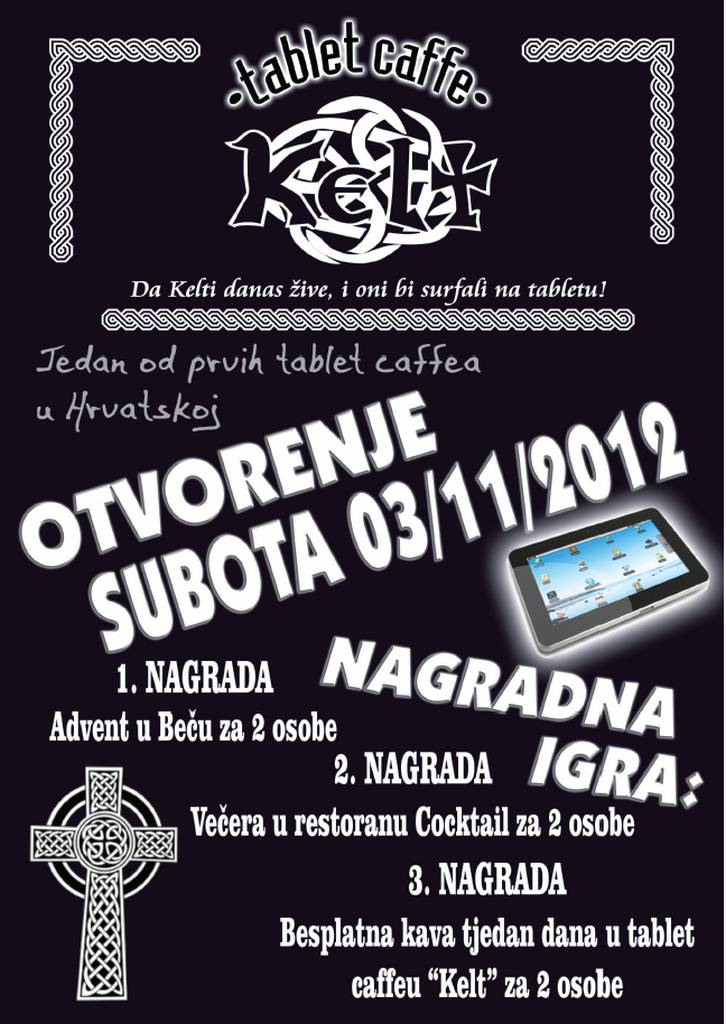 U večernjim subotnjim satima Kelt otvara svoja vrata uz hostese i nagradne igre. Više možete saznati na facebook stranici Tablet Caffe Kelt.