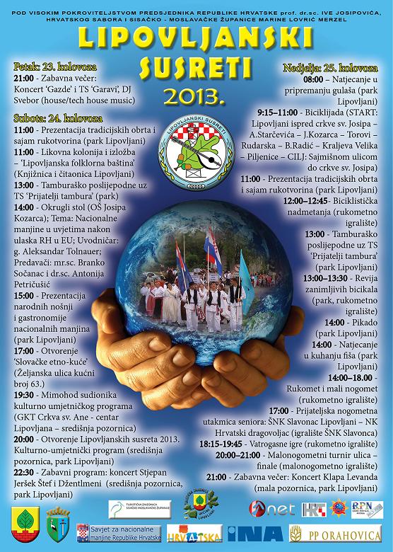 U 15 sati u parku započinje prezentacija narodnih nošnji i gastronomije nacionalnih manjina, kao uvod u večernji bogati kulturno-umjetnički program nacionalnih manjina, a u 17 sati je planirano otvorenje ‘Slovačke etno kuće’ u Željanskoj ulici 63 u Lipovljanima. U 19.30 započinje mimohod sudionika folklorne večeri nacionalnih manjina, a u 20 sati otvaranje ‘Lipovljanskih susreta’, koji se ove godine održavaju pod visokim pokroviteljstvom predsjednika Republike Hrvatske prof. dr. sc. Ive Josipovića, Hrvatskog sabora i Sisačko-moslavačke županice Marine Lovrić Merzel.