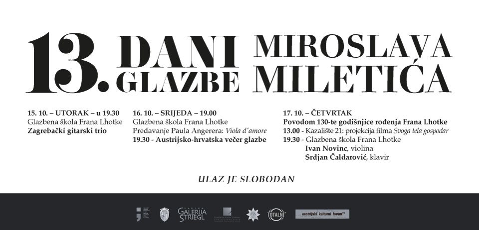 Festivalska srijeda, 16. listopada, posvećena je čudesnom glazbalu iz 17. stoljeća – violi d’amore. Glazbeni gosti koji će nam u popularnom polusatnom predstavljanju ponovno otkriti taj instrument su otac i sin – Paul i Christoph Angerer iz Beča. Potrebno je napomenuti da je Christoph Angerer već gostovao u Sisku, tijekom Međunarodnih dana viole, festivala iz kojeg su nastali Dani glazbe Miroslava Miletića. Kako je upravo Miletić bio jedan od prvih skladatelja za violu d’amore, u vrijeme renesanse ove povijesne gudaljke, predavanje će završiti verzijom Movimenta za violu d’amore i klavir, prema skladateljevim riječima – njegovom najveselijom skladbom. Program se nastavlja Austrijsko-hrvatkom večeri glazbe koju će, uz austrijske goste, izvesti i klarinetist Bruno Philipp, Tihana Herceg Ivšić, mezzospran i Lana Bradić na klaviru. Ova večer ostvarit će se pod pokroviteljstvom Austrijskog kulturnog foruma Zagreb.