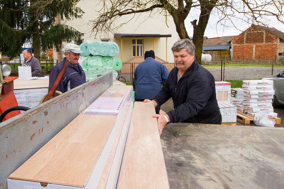 Materijal je kupljen sredstvima prikupljenima u akciji Hrvatskog Caritasa, te donacijama hrvatskih biskupija, župa, tvrtki i pojedinaca. O razmjerima potrebne pomoći najbolje govore brojke. Tako će obiteljima biti proslijeđeno oko 1700m2 laminata, 1300 m2 keramičkih pločica, 60 m2 linoleuma i vinilnih obloga, 120 m2 knaufa, 1000 litara boje za zidove, 1500 kilograma cementa, kao i sav ostali materijal potreban za sanaciju nastalih šteta. Svaka će obitelj primiti i paket namirnica i higijenskih potrepština, a nakon završetka sanacije Caritas će u sljedećim fazama pomoći potrebitima i  nabavkom osnovnog namještaja.
