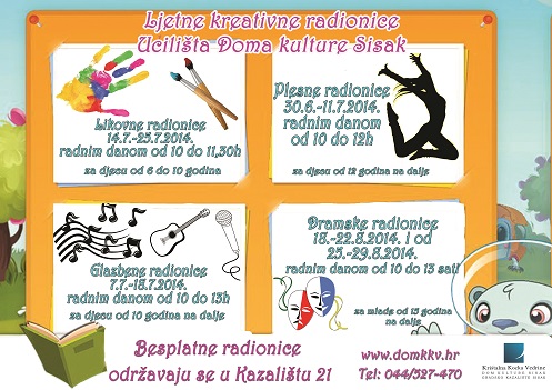 Plesne radionice pod vodstvom Jasminke Petek Krapljan započele su 30. lipnja i traju do 11.7.2014. godine radnim danima od 10 do 12 sati. Radionica je namijenjena djeci od 12 godina na dalje. Na radionici će djeca razvijati svijest o svom tijelu i pokretu, prostoru i interakciji s drugim plesačima u prostoru. Upoznat će se s osnovnim zakonitostima / odrednicama pokreta te načinom kreiranja vlastitog tjelesnog izričaja. Na radionici je ograničen broj polaznika (ukupno 15 polaznika).