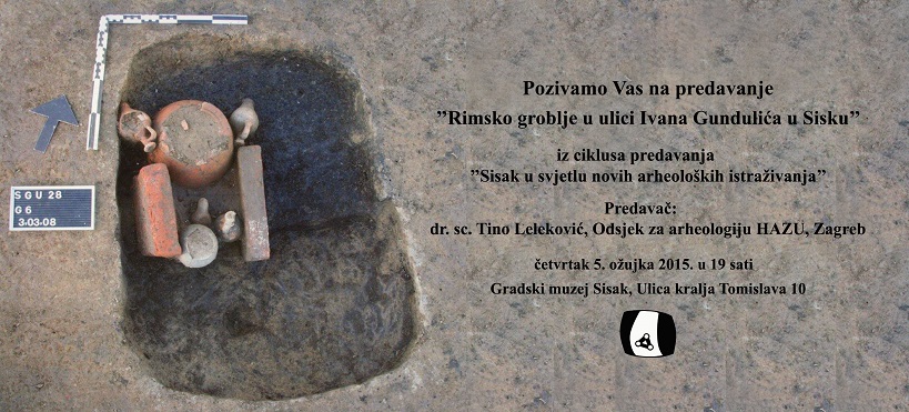U četvrtak, 5. ožujka 2015. nastavljamo s ciklusom predavanja „Sisak u svjetlu novih arheoloških istraživanja“. Predavanje pod nazivom „Rimsko groblje u ulici Ivana Gundulića u Sisku“ održat će dr. sc. Tino Leleković s Odsjeka za arheologiju HAZU u Zagrebu.