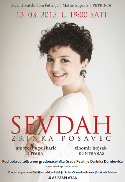 POU Hrvatski dom Petrinja i Bošnjačka nacionalna manjina Grada Petrinje organizira u petak, 13. ožujka, u 19 sati u velikoj dvorani Hrvatskog doma koncert sevdaha Zrinke Posavec uz pratnju Ambrozija Puškarića na gitari i Tihomira Hojsaka na kontrabasu. Ulaz je slobodan.