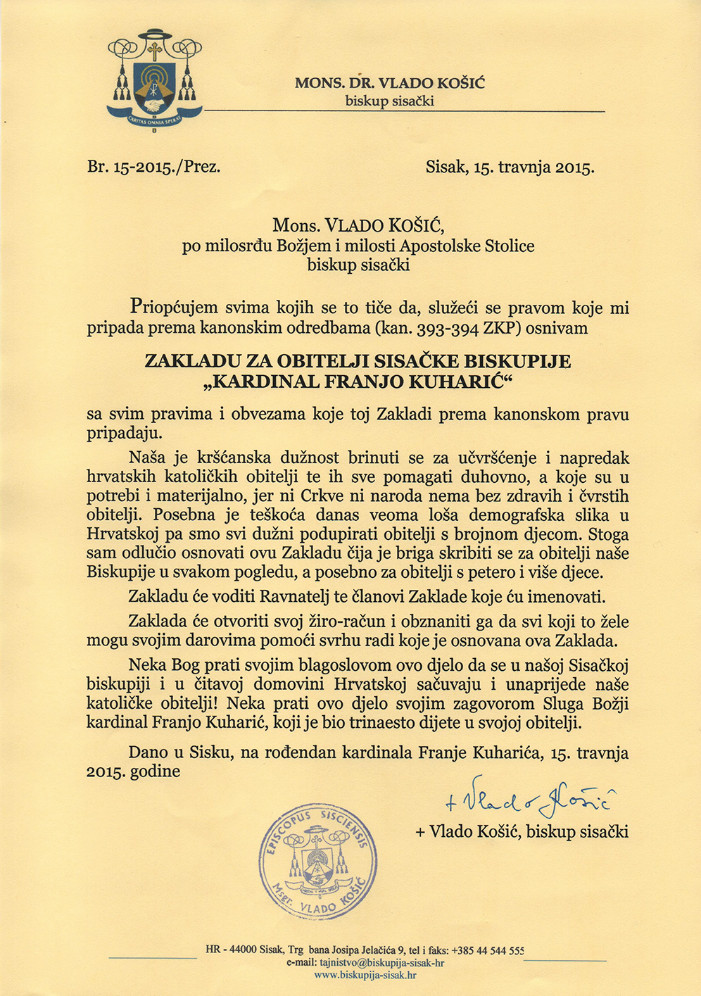 „Posebna je teškoća danas veoma loša demografska slika u Hrvatskoj pa smo svi dužni podupirati obitelji s brojnom djecom. Stoga sam odlučio osnovati ovu Zakladu čija je briga skrbiti se za obitelji naše Biskupije u svakom pogledu, a posebno za obitelji s petero i više djece“, istaknuo je biskup u dekretu o osnivanju.