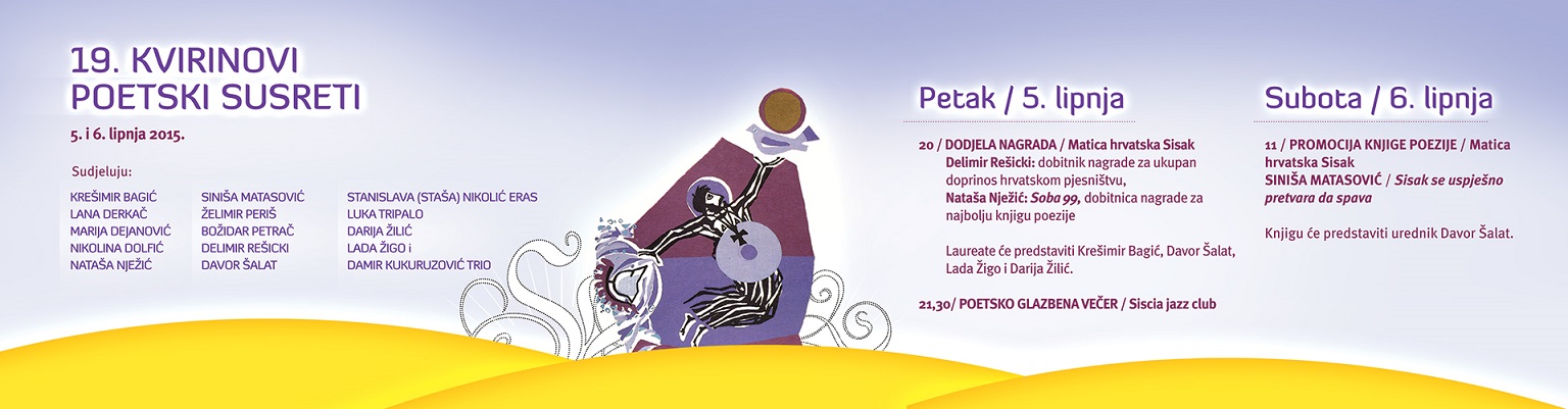 Matica hrvatska Sisak devetnaestu godinu  zaredom organizira manifestaciju Kvirinovi poetski susreti, a ove će se godine kroz nekoliko sadržaja u dva dana,  5. i 6. lipnja, sisačkoj publici predstaviti dvadesetak renomiranih pjesnika iz Hrvatske.
