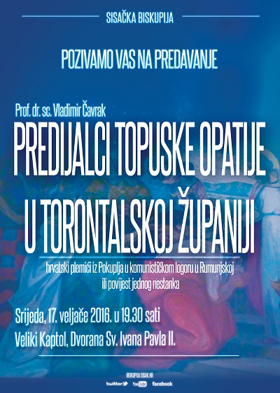 Predavanje „Predijalci Topuske opatije u Torontalskoj županiji“ održat će prof. dr. sc. Vladimir Čavrak, u srijedu 17. veljače u 19.30 sati u Dvorani sv. Ivana Pavla II. u sisačkom Velikom Kaptolu. Na predavanju će se prikazati povijest i sadašnjost zaboravljenih skupina Hrvata u Rumunjskoj popraćen bogatim autorskim foto materijalom. Očekuje se i nazočnost gostiju iz Rumunjske. U prilogu dostavljam i plakat za događaj.
