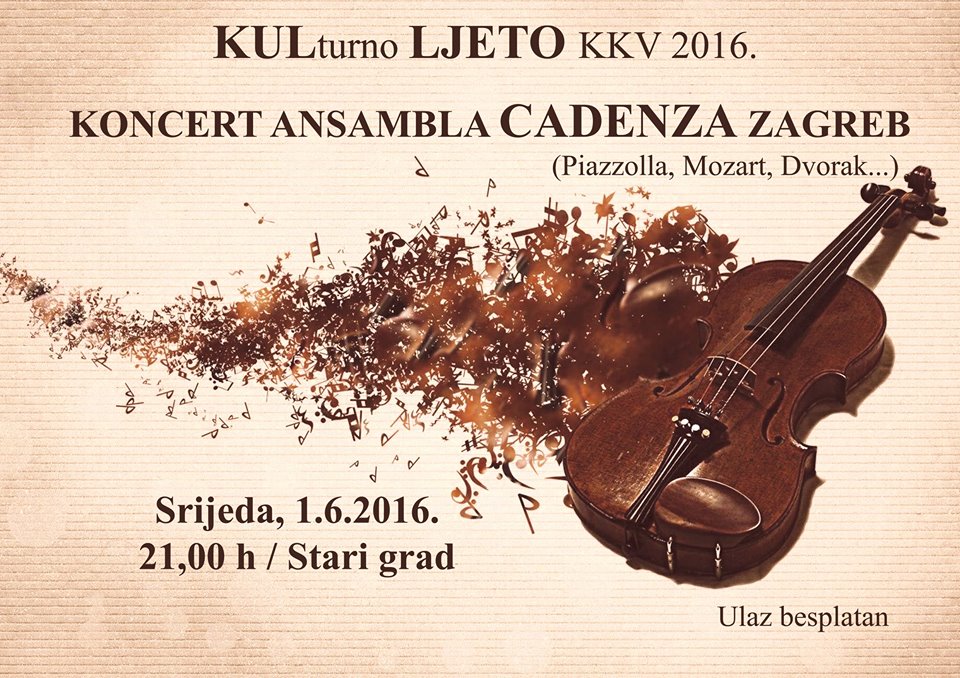 Koncertom Ansambla Cadenza iz Zagreba večeras službeno počinje program KULturnog LJETA KKV-a. Nastupajući na mnogobrojnim koncertnim pozornicama i ljetnim festivalima Ansabl Cadenza, kojeg čine Krešimir Marmilić i Gorjana Jurilj na violini, Petar Haluza na violi, Vinko Grubešić na violončelu, Saša Špoljar na kontrabasu, te Mario Čopor kao gost na klaviru, neprestano se potvrđuje kao kvalitetan komorni ansambl s interesantnim i kvalitetnim programima. U Sisku će gostovati u Atriju Starog grada i to 1. lipnja 2016.g. s početkom u 21 sat.