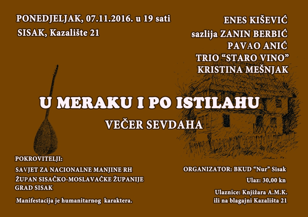 Glazbeni dio programa nosit će vrsni glazbenici okupljeni u sisačkom Triu “Starom vinu”, a o sevdahu će u maniri pjesnika govoriti cijenjeni i uvaženi književnik Enes Kišević.