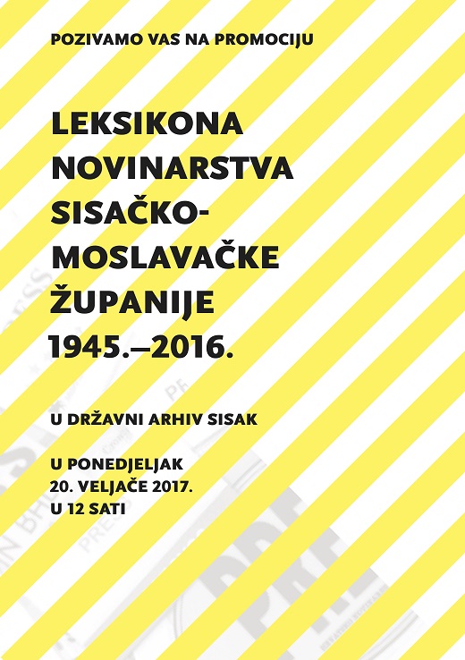 Promocija “Leksikona novinarstva Sisačko moslavačke županije 1945.-2016.”, autora Zdravka Strižića i Vladimira Pajtlara, u nakladi Hrvatskog novinarskog društva – ogranka Sisačko-moslavačke županije., bit će održana u ponedjeljak, 20. veljače, u 12 sati.