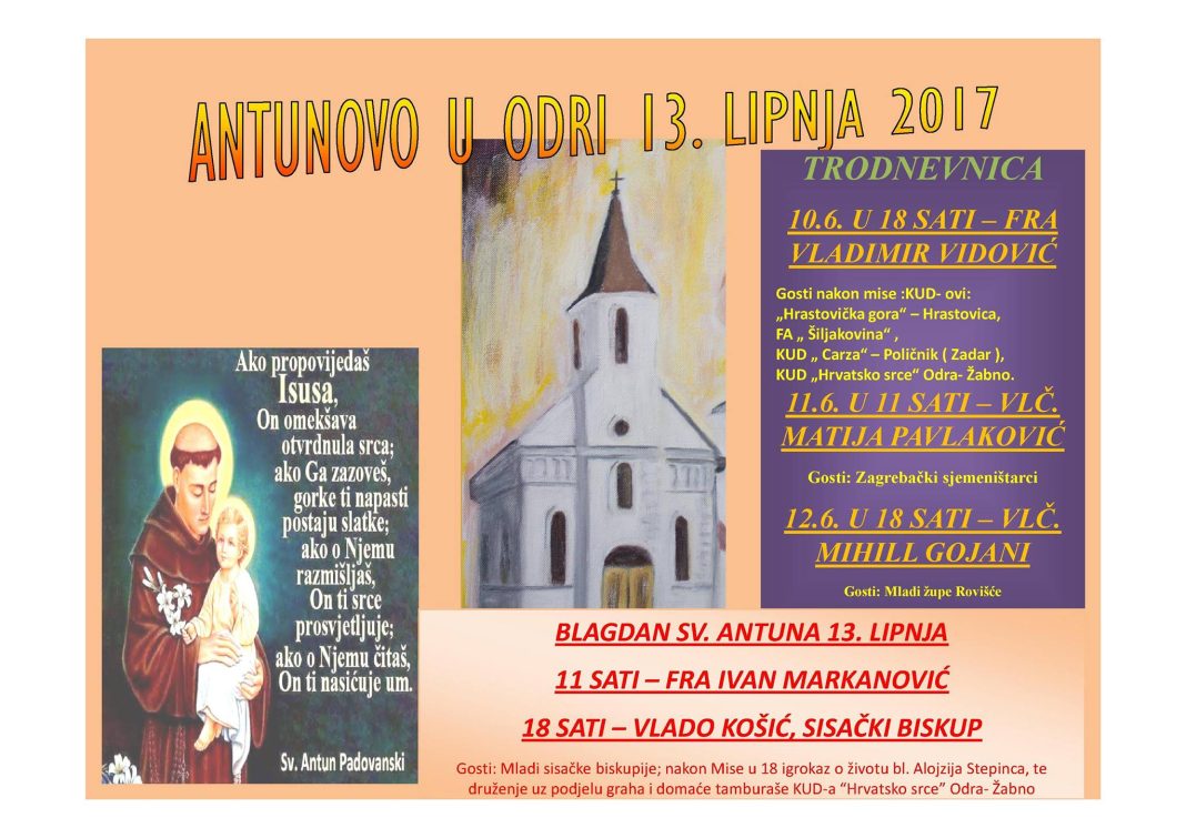 Proslava  sv. Antuna Padovanskog u Odri Sisačkoj održava se u utorak, 13. lipnja 2017. godine.