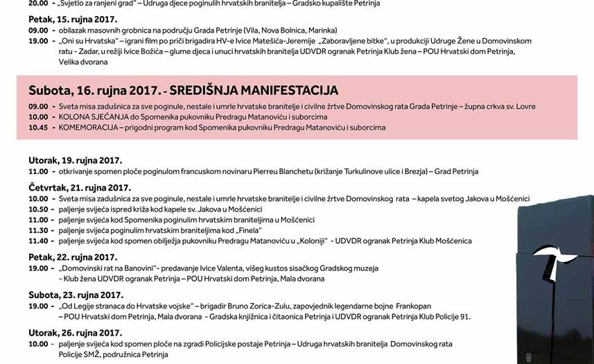10.00 h – paljenje svijeća kod spomen ploče na zgradi Policijske postaje Petrinja – Udruga hrvatskih branitelja