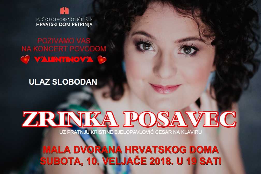 Koncert povodom Valentinova Zrinke Posavec, uz pratnju Kristine Bjelopavlović Cesar na klaviru, bit će održan u subotu, 10. veljače, u 19 sati Mala dvorana Hrvatskog doma