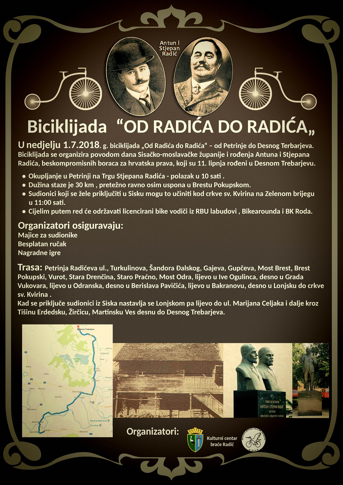 U nedjelju, 1. srpnja s početkom u 10 sati održava se biciklijada pod nazivom “Od Radića do Radića”. Biciklijada kreće iz Petrinje kod spomenika Stjepanu Radiću, a završava u Desnom Trebarjevu nedaleko od rodne kuće braće Radić.
