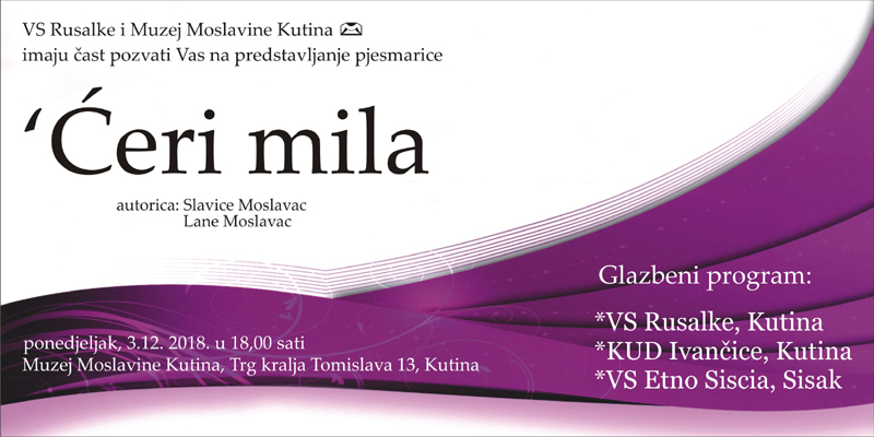 Vokalni sastav Rusalke i Muzej Moslavine Kutina organizira u Muzeju Moslavine Kutina u ponedjeljak, 3. prosinca 2018. u 18 sati promociju pjesmarice “Ćeri mila” autorica Slavice i Lane Moslavac.