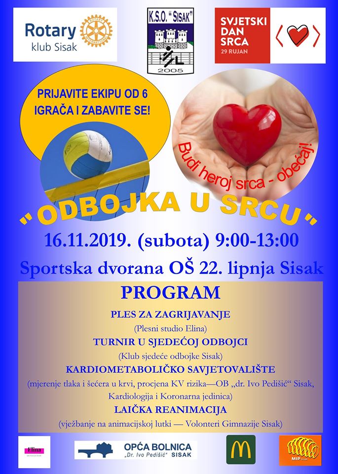 Rotary klub Sisak i ove godine u suradnji s Klubom sjedeće odbojke Sisak organizira program “Odbojku u srcu”. Cilj im je obilježiti Svjetski dan srca koji ove godine donosi poruku “Budi heroj srca-obećaj!“.