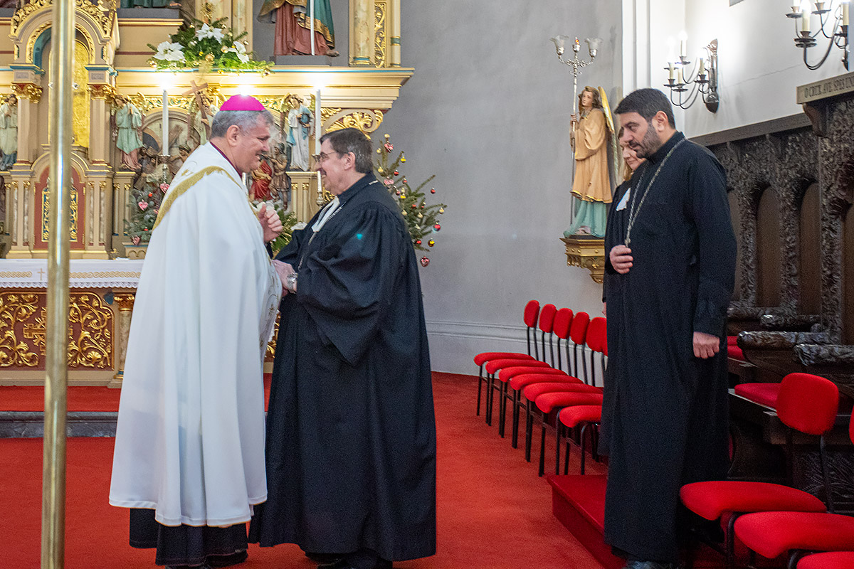 Obraćajući se prvi okupljenima o. Velinski je podsjetio kako smo nedavno proslavili rođenje Božjeg Sina koji nas sve povezuje te kako su temelj kršćanstva dvije zapovjedi ljubavi, prema Bogu i bližnjemu. „Tko je to naš bližnji? Svaki čovjek u potrebi bez razlike u vjeri i nacionalnosti. Ovogodišnje geslo molitvene osmine potiče nas na jačanje baš tog čovjekoljublja. Jedino čovjekoljubljem kroz djela dobrote možemo dokazati da smo stvarno Kristovi. Takvo čovjekoljublje osjetio sam i sam kada sam prije 16 godina došao u Zagreb. Nikoga nisam znao ni od svećenika, a posebno ne od katolika, a prvi su mi pomogli dva biskupa, biskup Košić i Mrzljak. Oni su i kasnije bili ti kojima sam se uvijek mogao obratiti za savjet ili pomoći u svakom trenutku. E to je pravo evanđelje, to je čovjekoljublje, ono jedinstvo i zajedništvo koje tražimo“, ustvrdio je Velinski.