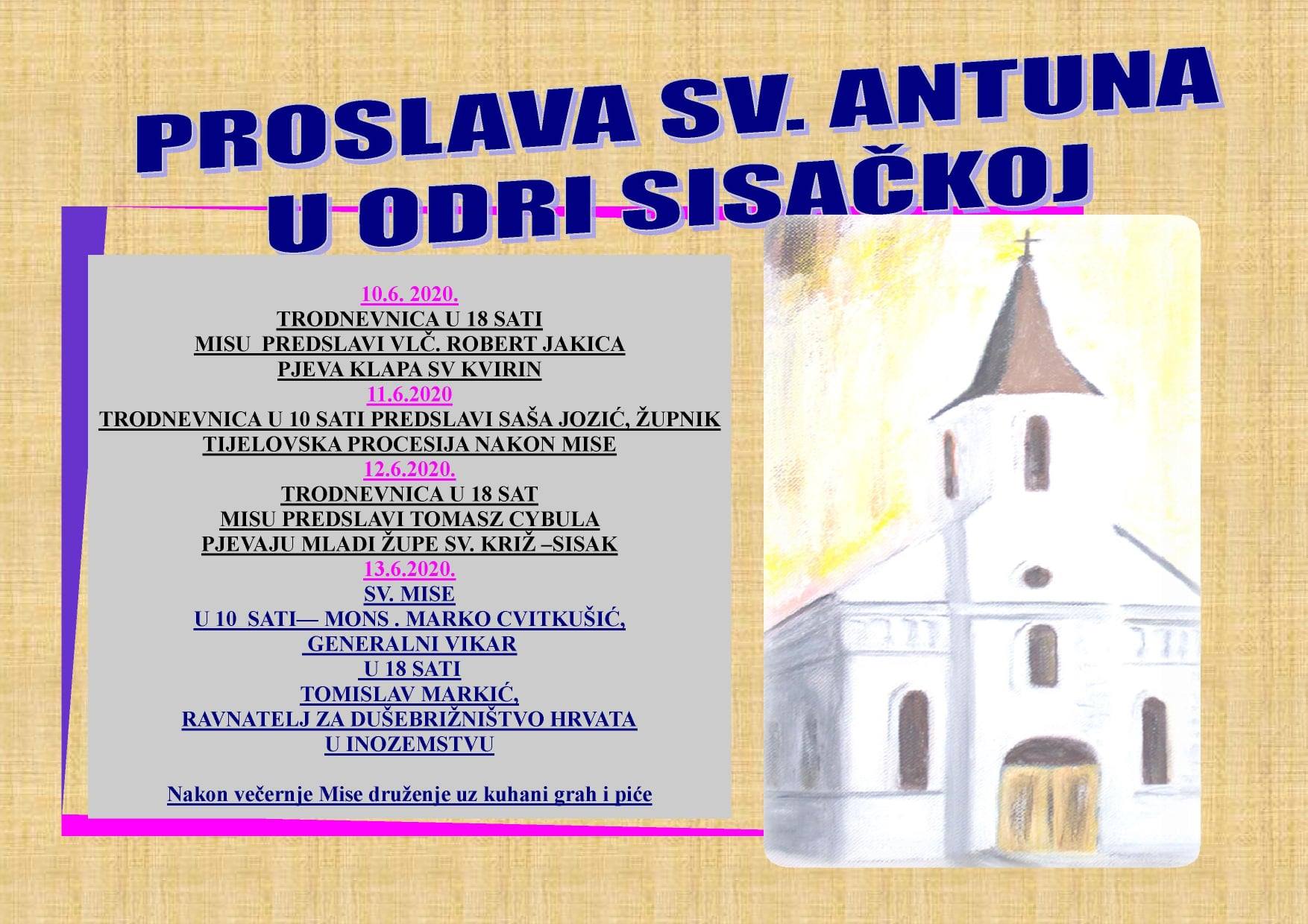 Župa Odra svečano će u subotu, 13. lipnja proslaviti blagdan svog suzaštitnika sv. Antuna Padovanskog. Svečano misno slavlje u 10 sati predvodit će generalni vikar sisačke biskupije mons. Marko Cvirkušić, a večeranje svlavlje u 18. sati ravnatelj Dušobrižništva za Hrvate u inozemstvu dr. Tomislav Markić.