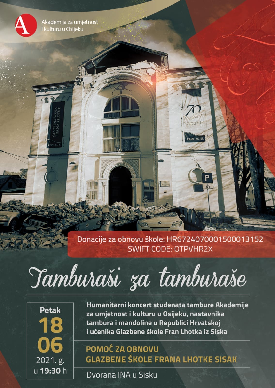 Humanitarni koncert “Tamburaši za tamburaše” će se održati u petak, 18. lipnja, u dvorani INA u 19.30 sati. Sredstva prikupljena na koncertu namijenjena su obnovi Glazbene škole Fran Lhotka.