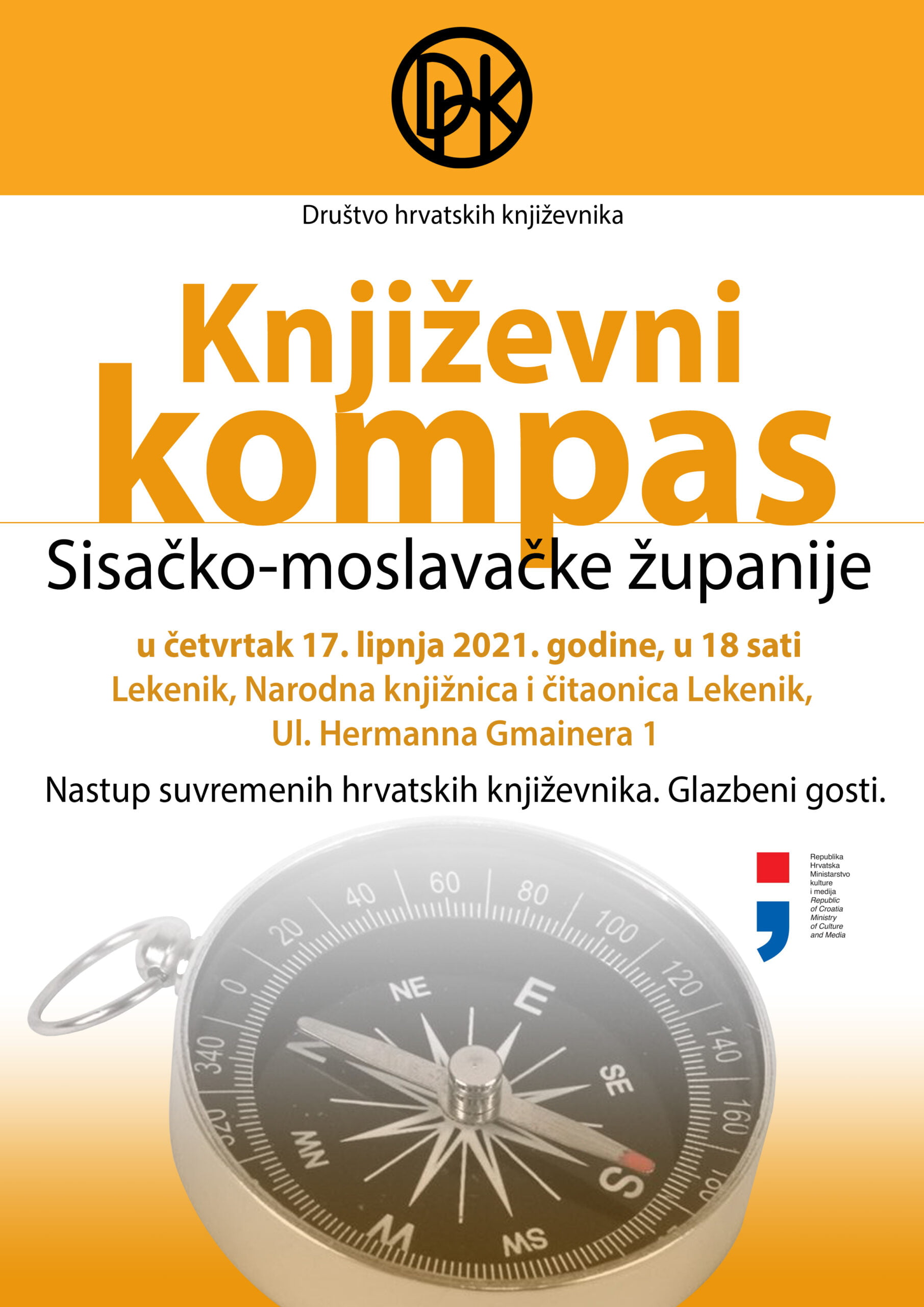 “Književni kompas Sisačko-moslavačke županije” prvi put održat će se u Lekeniku. Tribina će biti upriličena na otvorenom, u četvrtak, 17. lipnja 2021., u parku ispred Narodne knjižnice i čitaonice Lekenik s početkom u 18 sati.