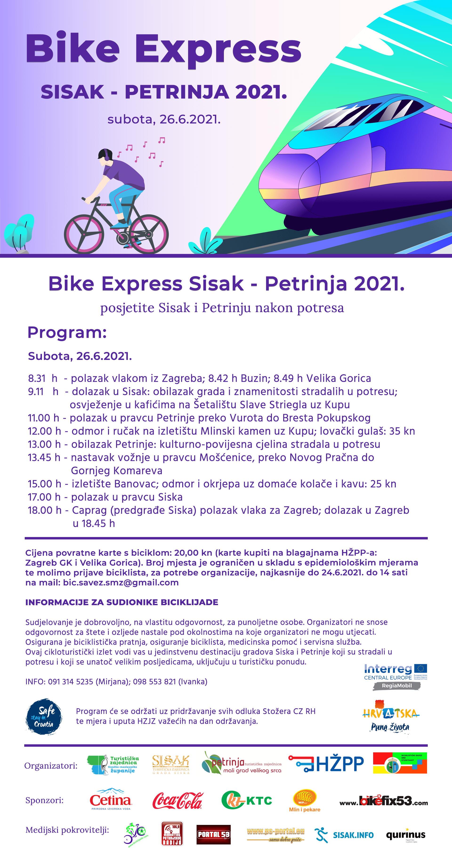 Veliki i mali, profesionalni sportaši i rekreativci, sve punoljetne osobe bez obzira na dob – svi ste pozvani! Uskočite u BIKE EXPRESS u subotu, 26.6.2021. i pridružite se na biciklijadi Sisak – Petrinja!