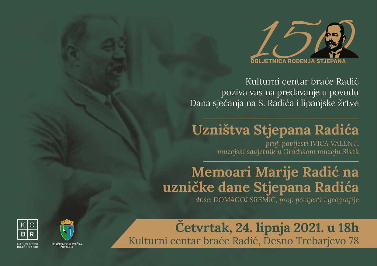 Kulturni centar braće Radić i ove godine predavanjima o Stjepanu Radiću obilježava Dan sjećanja na Stjepana Radića i lipanjske žrtve. Predavanja će održati dr.sc. Domagoj Sremić i prof. Ivica Valent u ČETVRTAK, 24. lipnja 2021. godine u Desnom Trebarjevu 78 s početkom u 18 sati.