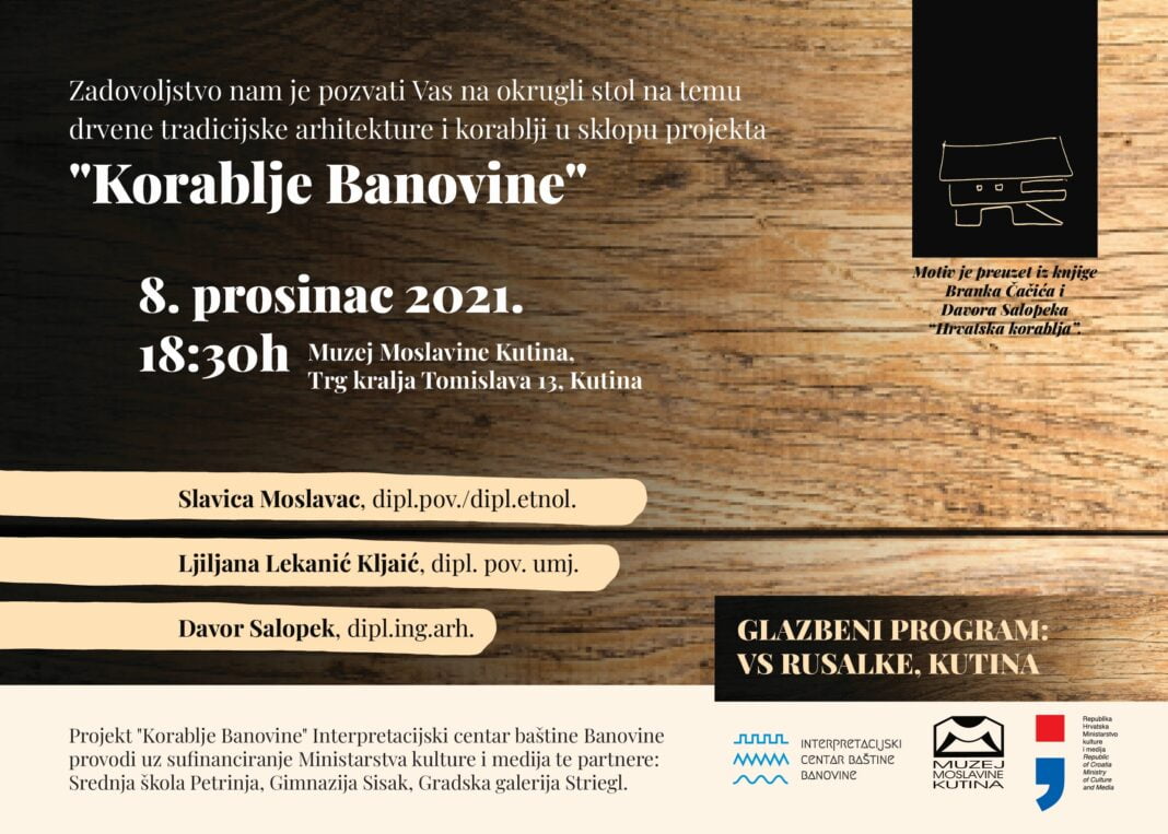 Okrugli stol na temu drvene tradicijske arhitekture i korablji koji će se u srijedu, 8. prosinca 2021. s početkom u 18:30h održati u Muzeju Moslavine Kutina, Trg kralja Tomislava 13, Kutina.