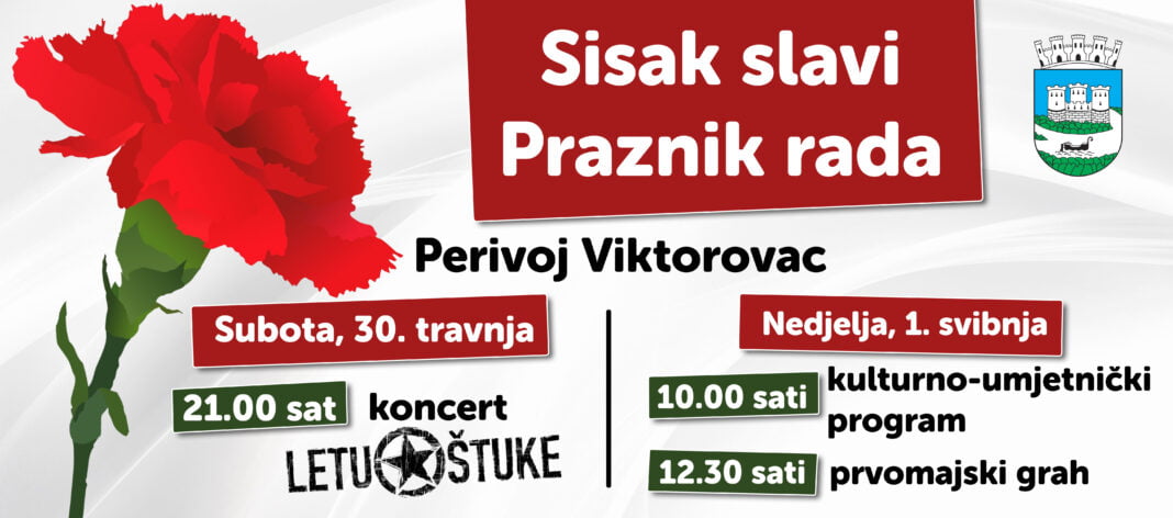 Grad Sisak organizira dvodnevnu proslavu Međunarodnog praznika rada u Perivoju Viktorovac. Program će početi u subotu, 30. travnja 2022. godine kada će koncert s početkom u 21 sat održati grupa Letu štuke.