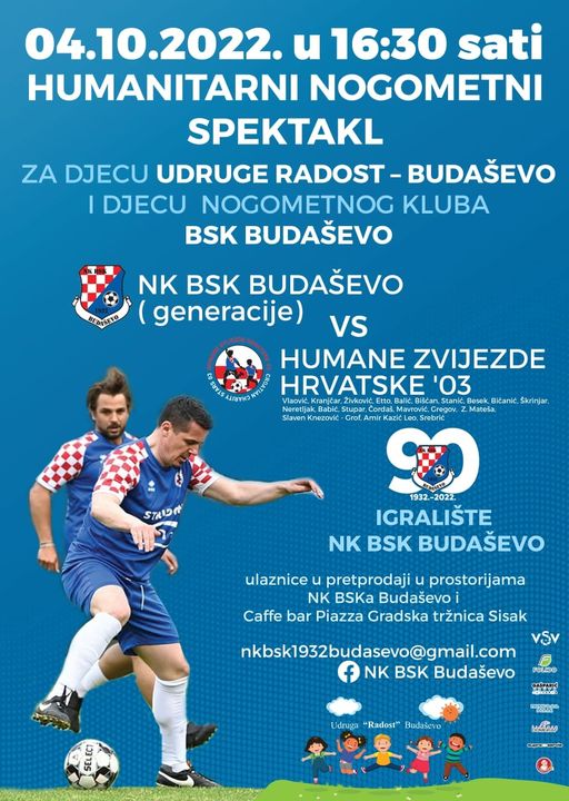 Humanitarna utakmica između Humanih zvijezde Hrvatske ’03 i generacije NK BSK-a će se odigrati povodom proslave 90. godišnjice postojanja kluba. Utakmica je na rasporedu u utorak, 4. listopada, u 16,30 sati. Sav prihod namijenjen je za djecu NK BSK-a i djecu udruge Radost iz Budaševa.