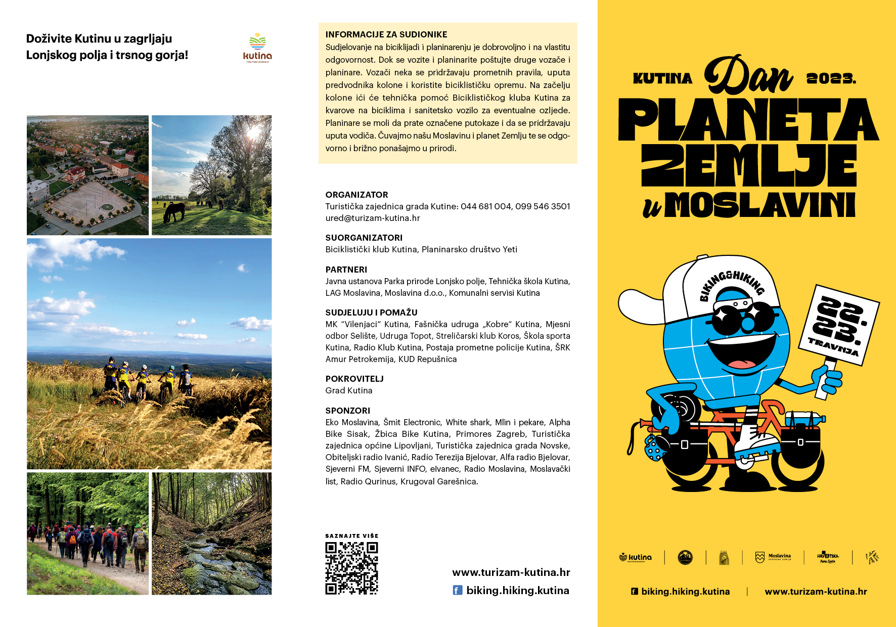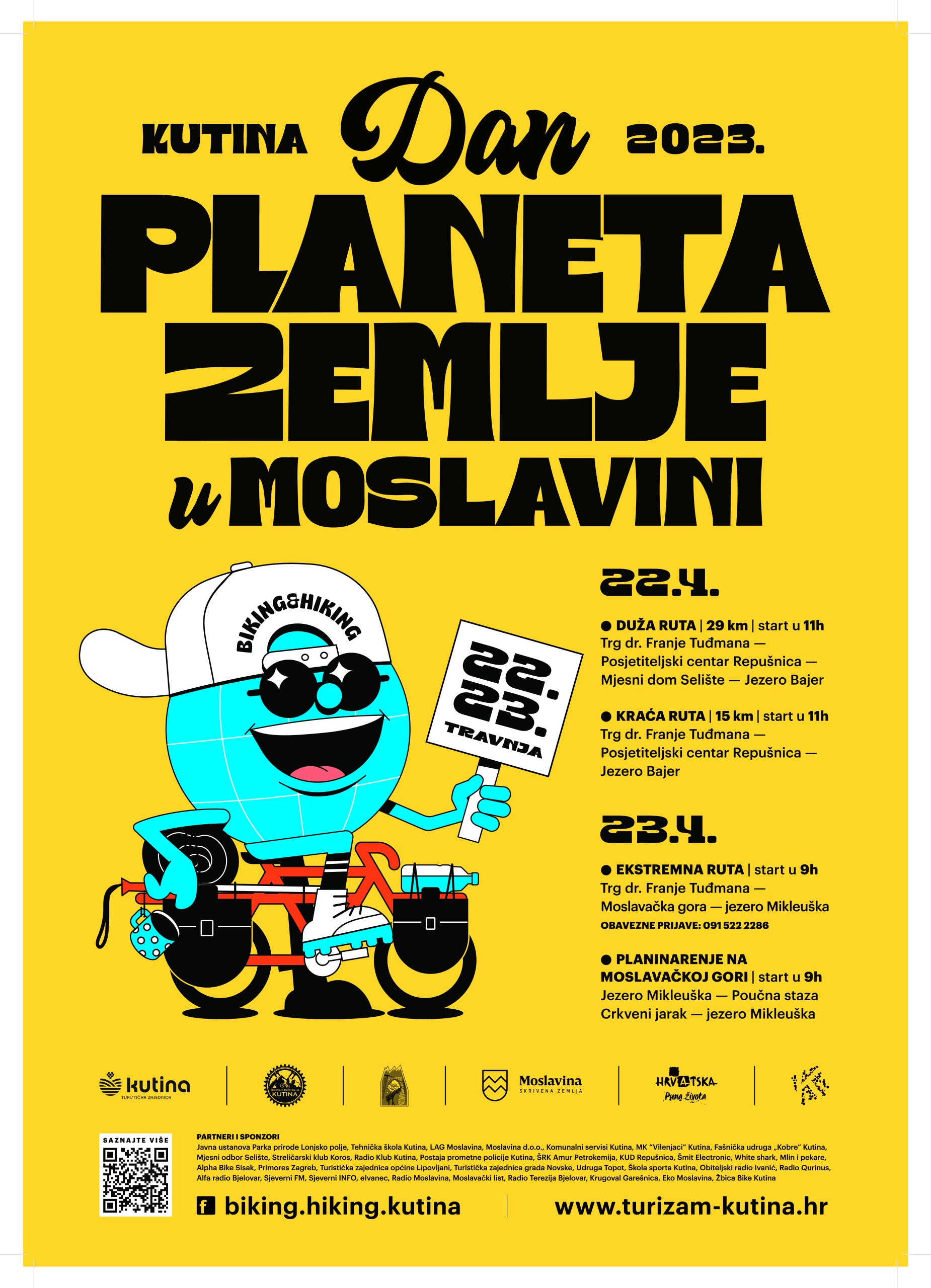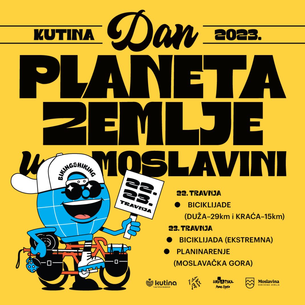 Turistička zajednica grada Kutine, Biciklistički klub Kutina i Planinarsko društvo Yeti Kutina organiziraju veliku rekreativno-zabavnu manifestaciju „Dan planeta Zemlje u Moslavini“ koja se održava za vikend 22.4.-23.4.2023. u Kutini, a uključuje biciklijade i planinarenje u prekrasnom krajoliku Moslavine.