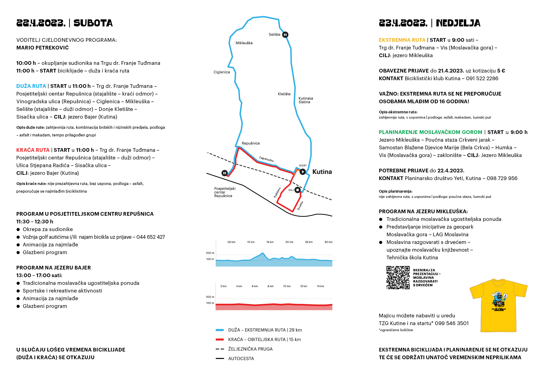 Nedjelja, 23.4.2023., rezervirana je za ekstremnu biciklističku rutu i planinarenje Moslavačkom gorom. Ekstremna biciklistička ruta, uključuje uspone i podloge od asfalta, makadama i šumskih puteva, starta u 9 sati na Trgu dr. Franje Tuđmana u Kutini i završava na jezeru Mikleuška u Regionalnom parku Moslavačka gora. Ekstremna biciklistička ruta nije preporučljiva za osobe mlađe od 16 godina, a kotizacija iznosi 5 EUR uz obavezne prijave do 21.4.2023. na broj: 091 522 2286 (Biciklistički klub Kutina).