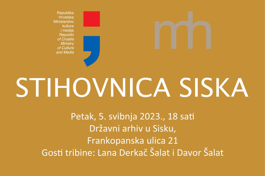 Sljedeća ”Stihovnica Siska” Matice hrvatske na rasporedu je u petak 5. svibnja u 18 sati, u Državnom arhivu u Sisku (Frankopanska ulica 21). Gosti tribine su Lana Derkač Šalat i Davor Šalat. Predstavit će nam se sa svojim novijim poetskim opusom, a u nastavku večeri ćemo se dotaknuti i njihovih hvaljenih, nedavno tiskanih knjiga, Davorovih eseja o pjesništvu ”Povećalo za poeziju” te Lanine zbirke priča ”Adresar smrti”.