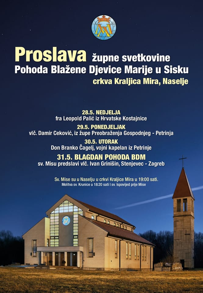 Blagdan Pohoda Blažene Djevice Marije svečano će biti proslavljen u srijedu, 31. svibnja u istoimenoj sisačkoj župi. Središnje misno slavlje u 19 sati predvodit će Ivan Grinišin, župnik u Stenjevcu.