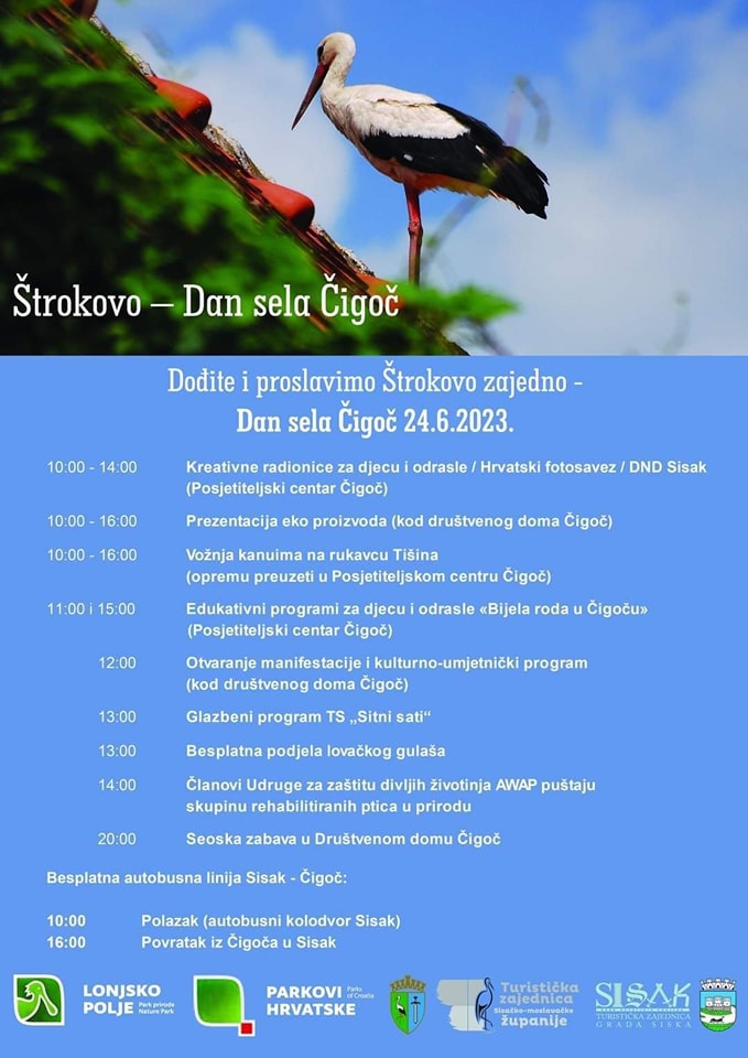 Dođite i proslavimo Š𝘁𝗿𝗼𝗸𝗼𝘃𝗼 – 𝗗𝗮𝗻 𝘀𝗲𝗹𝗮 Č𝗶𝗴𝗼č zajedno 𝟮𝟰.𝟬𝟲.𝟮𝟬𝟮𝟯. – poručuju iz Parka prirode Lonjsko polje.