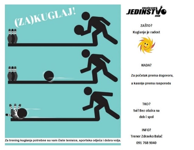 “Pokušajte jednim telefonskim pozivom svoju davnu želju ili članova obitelji pretvoriti u realnost. Osim redovnih kvalitetnih treniga na kuglani SRC Sisak (ispod bazena) u ponudi su relaksirajući momenti u ugodnom okruženju.” – poručuju iz sisačkog ŠKK Jedinstvo.