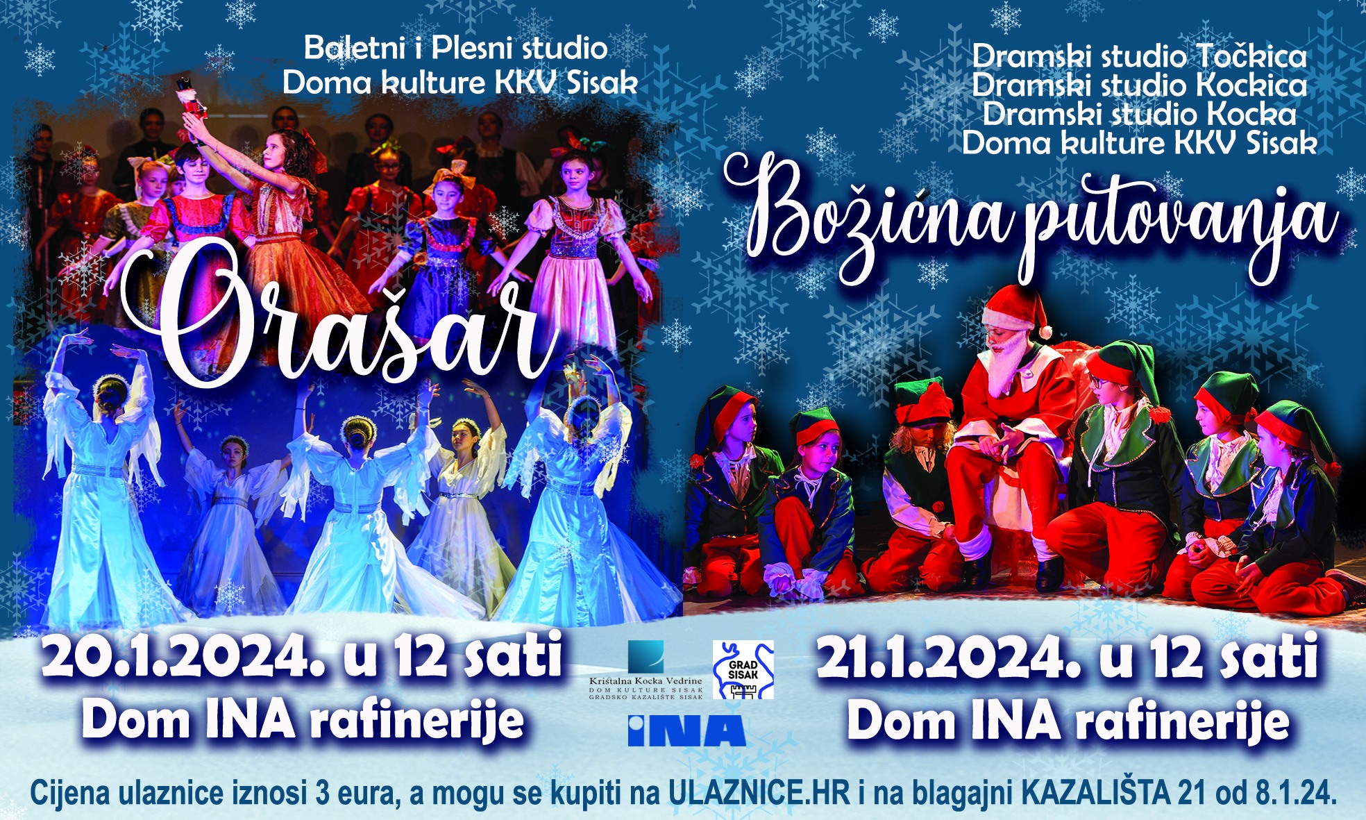 Na početku 2024. godine Dramski studiji Kreativnog učilišta Doma kulture KKV Sisak – “Točkica”, “Kockica” i “Kocka” izvesti će tri blagdanska igrokaza pod zajedničkim nazivom BOŽIĆNA PUTOVANJA u nedjelju, 21.1.2024. u 12 sati u Domu INA rafinerije.