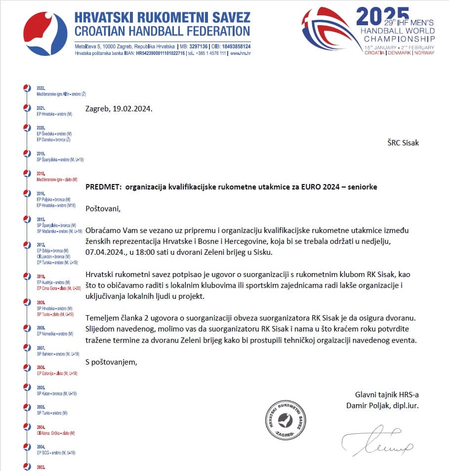 dostavljamo Vam Ugovor o suorganizaciji kvalifikacijske utakmice za EURO 2024 – seniorke i dopis u kojem Vas molimo da nam osigurate korištenje Sportske dvorane Zeleni Brijeg, 06. i 07. travnja 2024. godine u svrhu organizacije predmetnog događaja.