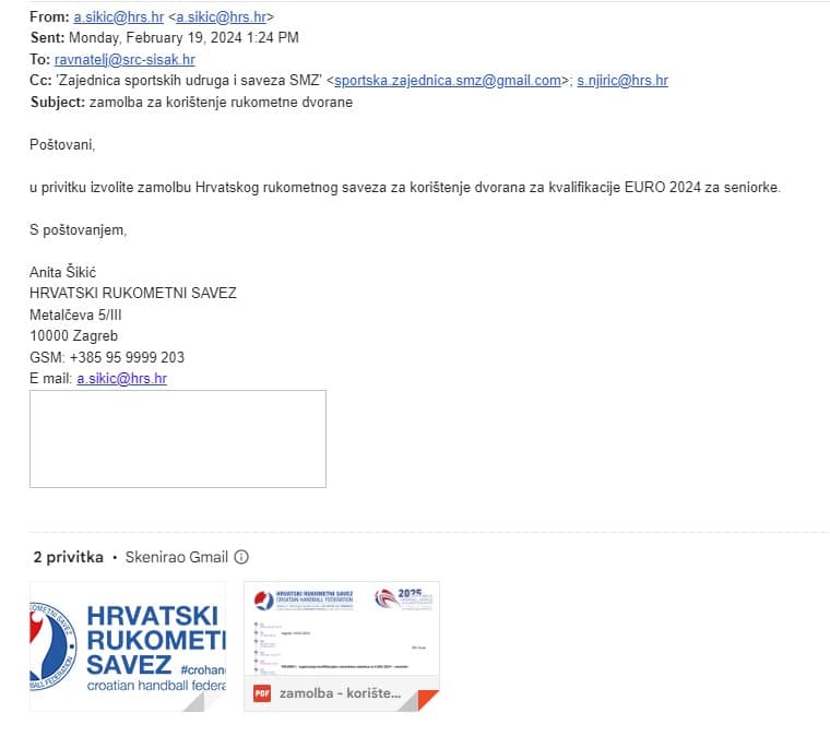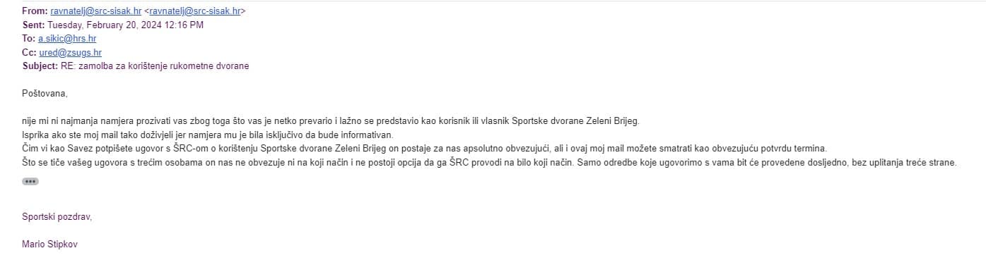 No, u tom mailu je bio priložen i već potpisani ugovor Rukometnog kluba Sisak s Hrvatskim rukometnim savezom kojeg su sklopili dan ranije, 14. veljače, i u kojem se već navodi, kao mjesto održavanja utakmice, Sportska dvorana Zeleni Brijeg. A dan kasnije je korištenje te dvorane zatraženo službeno od ŠRC-a.