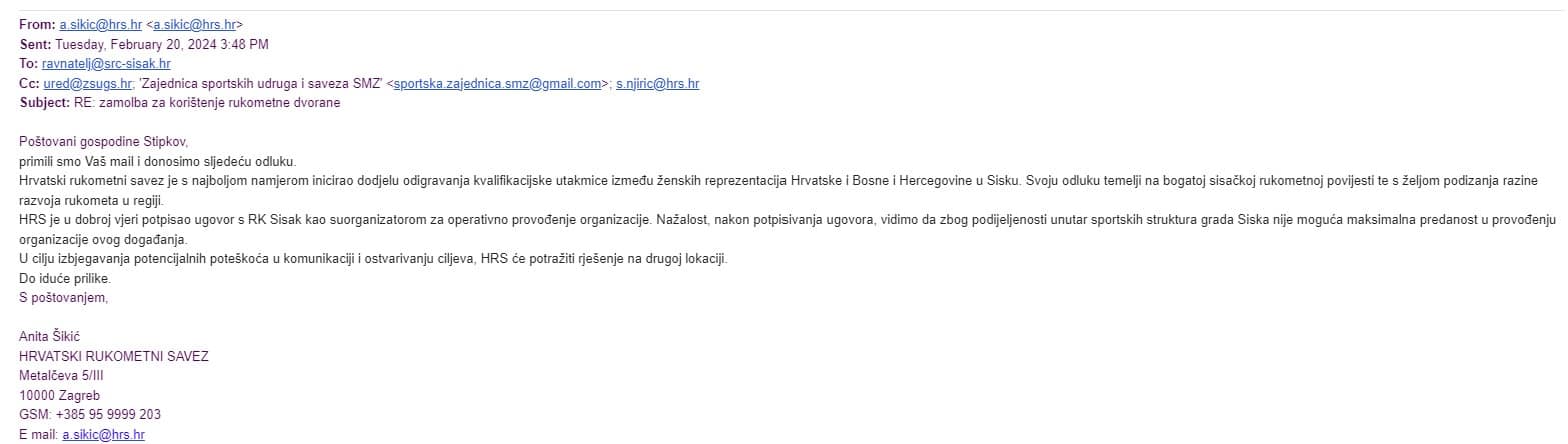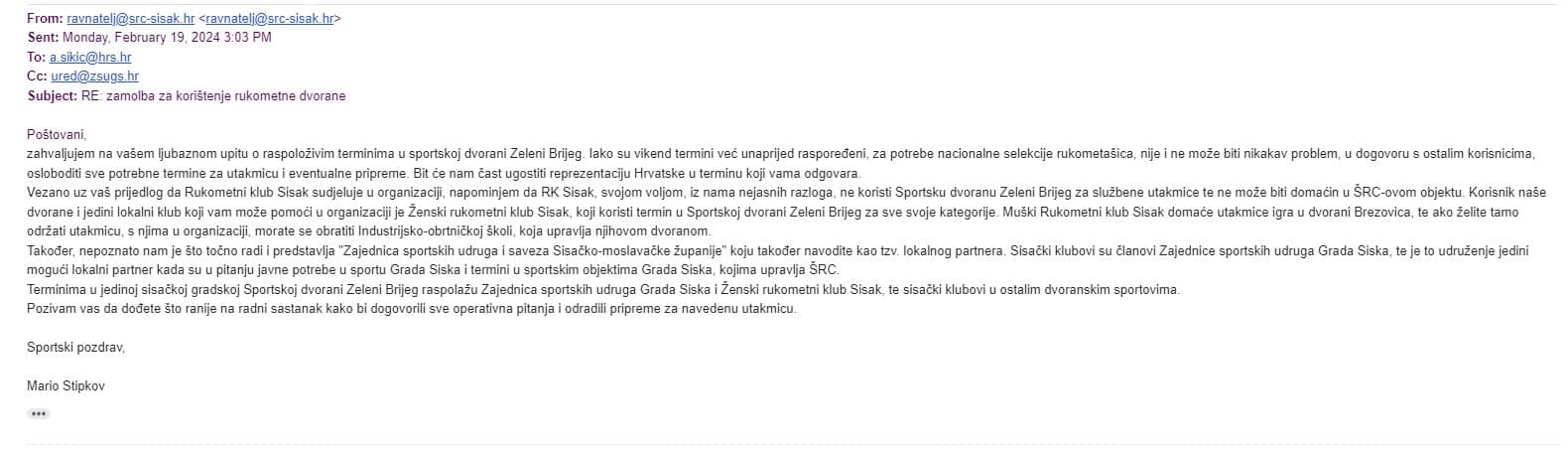 Iako nismo dobili naknadnu, ili moguću prethodnu, komunikaciju između Grada Siska, ŠRC-a, RK Sisak i Hrvatskog rukometnog saveza koji bi pokazali kako su se odvijali daljnji i raniji pregovori oko ove utakmice, a koji dio se i približno citira od strane Rukometnog kluba Sisak, dobili smo dopis Rukometnog kluba Sisak prema ŠRC-u upućen 15. veljače kojim se traži Sportska dvorana Zeleni Brijeg za odigravanje utakmice reprezentacija.