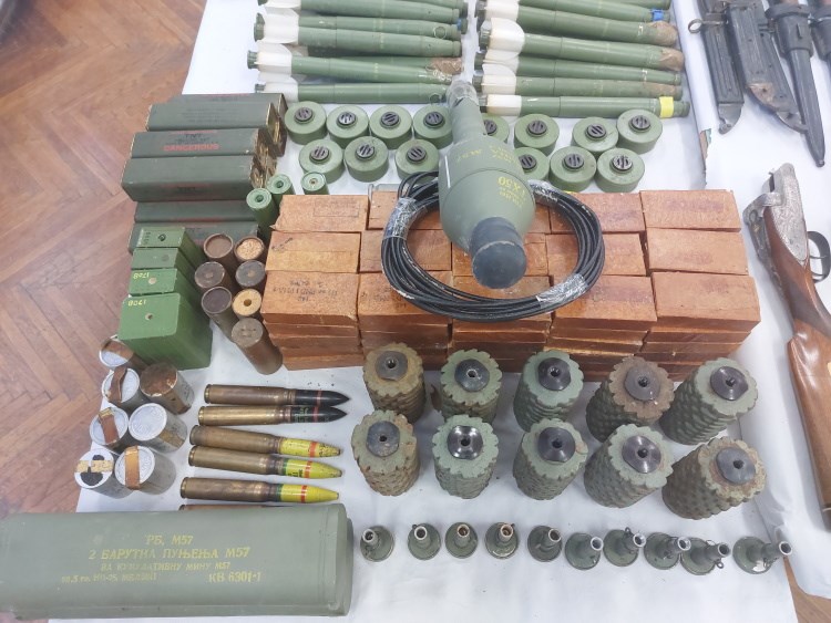 44 puške (vojne, lovačke i zračne), 35 pištolja, 147 spremnika za pištolje i puške, 16 435 komada raznog streljiva, 757 komada zrna za izradu pištoljskog streljiva, 712 lovačkih kapisli, 207 dijelova oružja, 113 ručnih bombi, 8 upaljača, 2 prigušivača, 1 nepotpuni prigušivač, 25 komada detonatorskih kapisli, 24 upaljača za protupješačke mine, 6 specijalnih diverzantskih upaljača , 11 topničkih granata, 8 komada barutnih punjenja za raketni bacač, 3 zolje, 88 raznih mina, jedna ručno izrađena eksplozivna naprava, 10 metara sporogorećeg štapina, 20,15 kilograma eksploziva, 2047,9 grama baruta, 6,200 grama sačme, preša za punjenje baruta za izradu streljiva, dva komada mjerica za punjenje patrona, dva metalna lijevka za punjenje streljiva, 44 bravarska označivača raznih slova i brojeva.