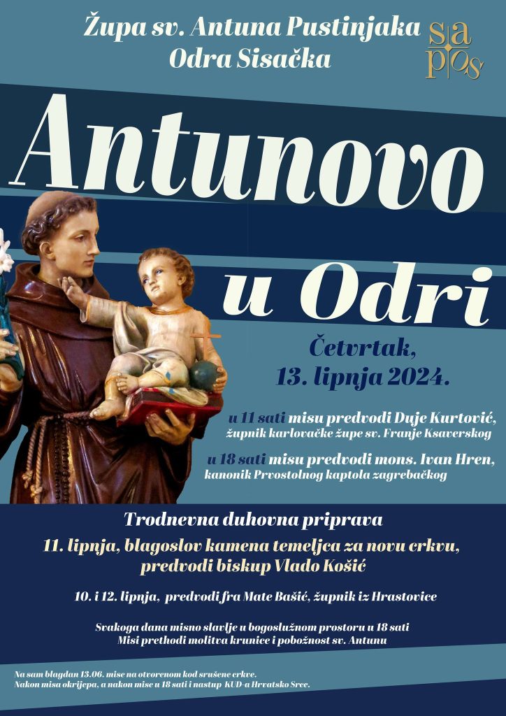 Župa Odra Sisačka proslavit će Središnje misno slavlje s početkom u 11 sati, kod srušene župne crkve, predvodit će Duje Kurtović, župnik karlovačke župe sv. Franje Ksaverskog, a misu u 18 sati Ivan Hren, kanonik Prvostolnog kaptola zagrebačkog.