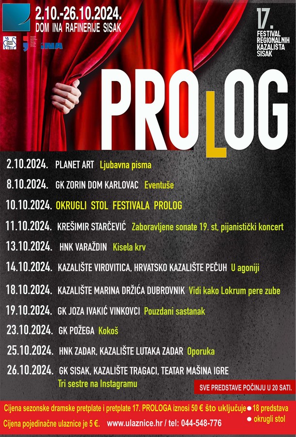 U organizaciji Doma kulture Kristalna kocka vedrine održat će se 17. po redu Festival regionalnih kazališta Prolog, a donosi čak 8 predstava gostujućih kazališta, okrugli stol i koncert klasične glazbe te premijerni naslov Gradskog kazališta Sisak, Kazališta Tragači i Teatra Mašina igre!