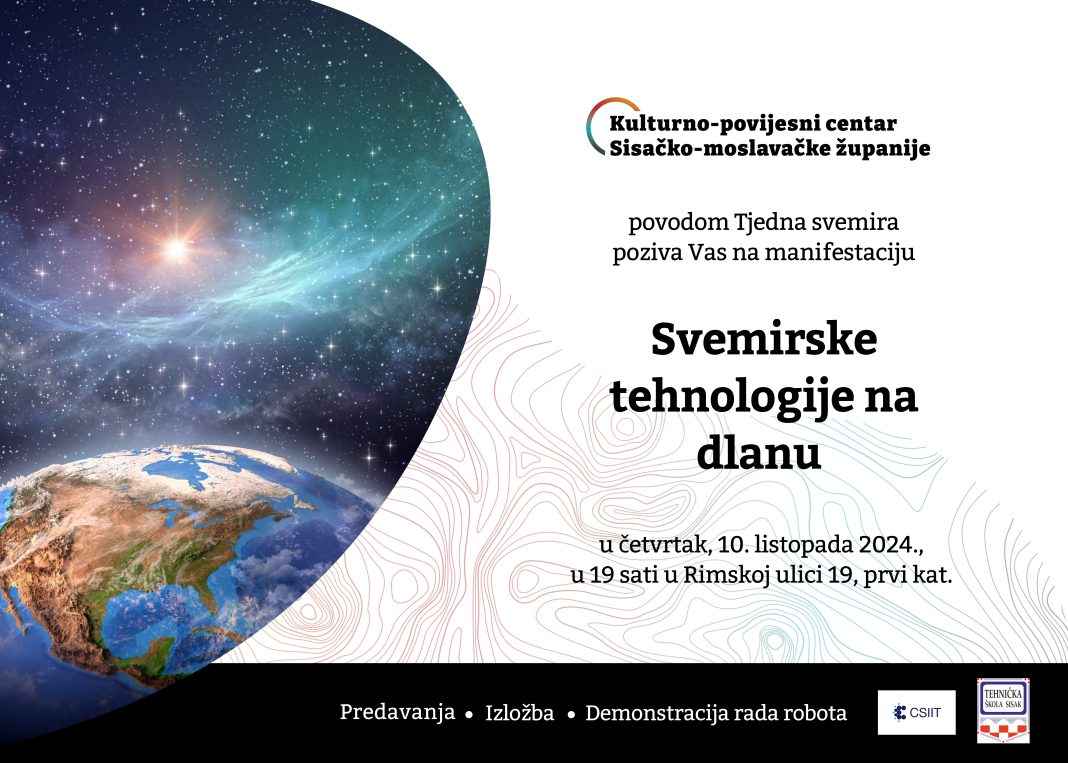 Kulturno-povijesni centar Sisačko-moslavačke županije u suradnji s Centrom za svemirske i inovativne tehnologije SMŽ i Tehničkom školom Sisak organizira manifestaciju pod nazivom “Svemirska tehnologija na dlanu” u četvrtak, 10. listopada 2024. s početkom u 19 sati na našoj novoj adresi Rimska 19, Sisak.