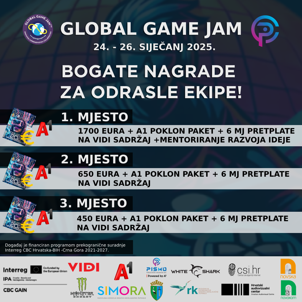 Od 24. do 26. siječnja, Novska postaje domaćin još jednog izdanja Global Game Jam-a, hrvatske verzije svjetskog natjecanja u izradi videoigara. Organizator ovog #gamedev događaja, Poduzetnički inkubator PISMO powered by A1, poziva sve gamedevelopere, od početnika do profesionalaca, da prihvate izazov, testiraju svoje vještine i natječu se za vrijedne nagrade koje su osigurali A1 Hrvatska d.o.o., brend gaming opreme White Shark, medijska kuća VIDI te inkubator PISMO powered by A1.