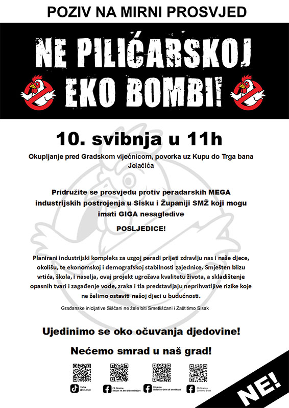 U subotu, 10. svibnja, u 11 sati dvije građanske inicijative: Siščani ne žele biti Smetlišćani i Zaštitimo Sisak, zajedno sa aktivistima iz Velike Ludine, Potoka, Lekenika i Petrinje organiziraju mirni prosvjed protiv izgradnje mega klaonice peradi i mogućeg bioplinskog postrojenja tvrtke Premium Chicken Company u industrijskoj zoni Sisak Jug u Capragu te prosvjed protiv megalomanskog projekta izgradnje niza peradarnika, i popratnih pogona, u Sisačko-moslavačkoj županiji.