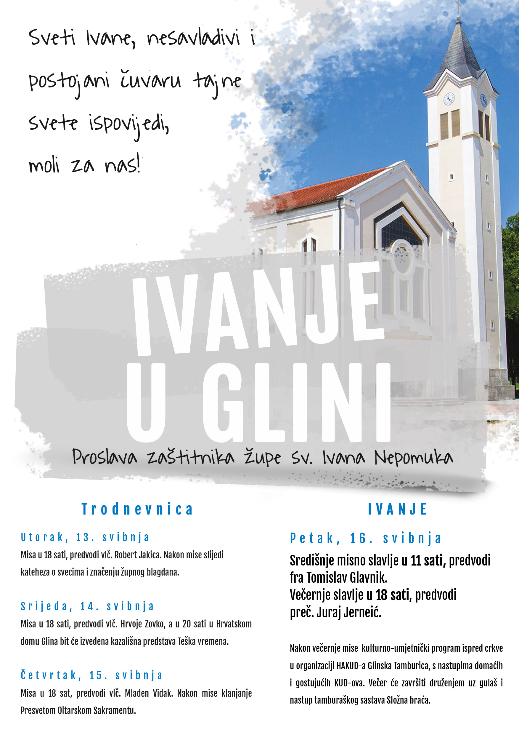 Župa Glina, svečano će u petak, 16. svibnja 2025. proslaviti blagdan svog zaštitnika sv. Ivana Nepomuka. Središnje misno slavlje u župnoj crkvi započinje u 11 sati, a predvodi ga ravnatelj Hrvatskog Caritasa fra Tomislav Glavnik.