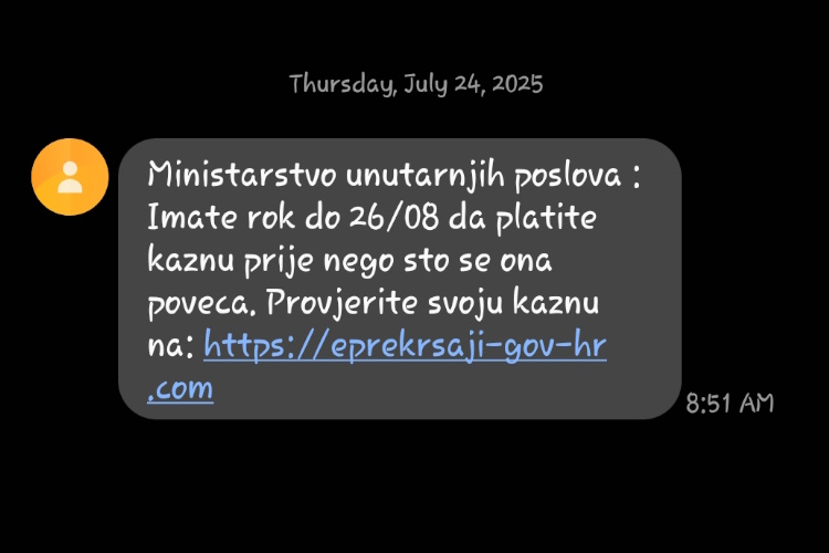 Policijski službenici Ministarstva unutarnjih poslova nikada ne šalju građanima obavijesti o počinjenim prekršajima putem SMS poruka, niti traže unos osobnih podataka ili podataka s bankovnih kartica (uključujući broj kartice i CVV kod) u bilo kakav internetski obrazac ili na mrežnu stranicu. Službene obavijesti dostavljaju se isključivo preporučenom poštom, u pisanom obliku.