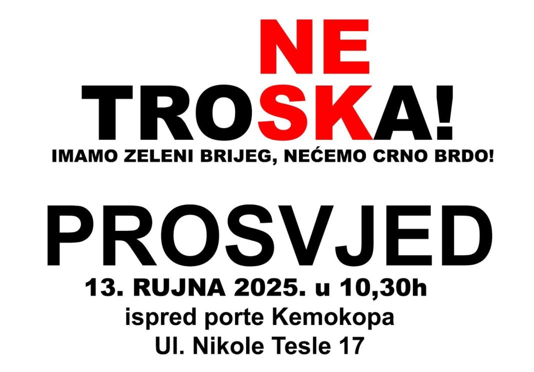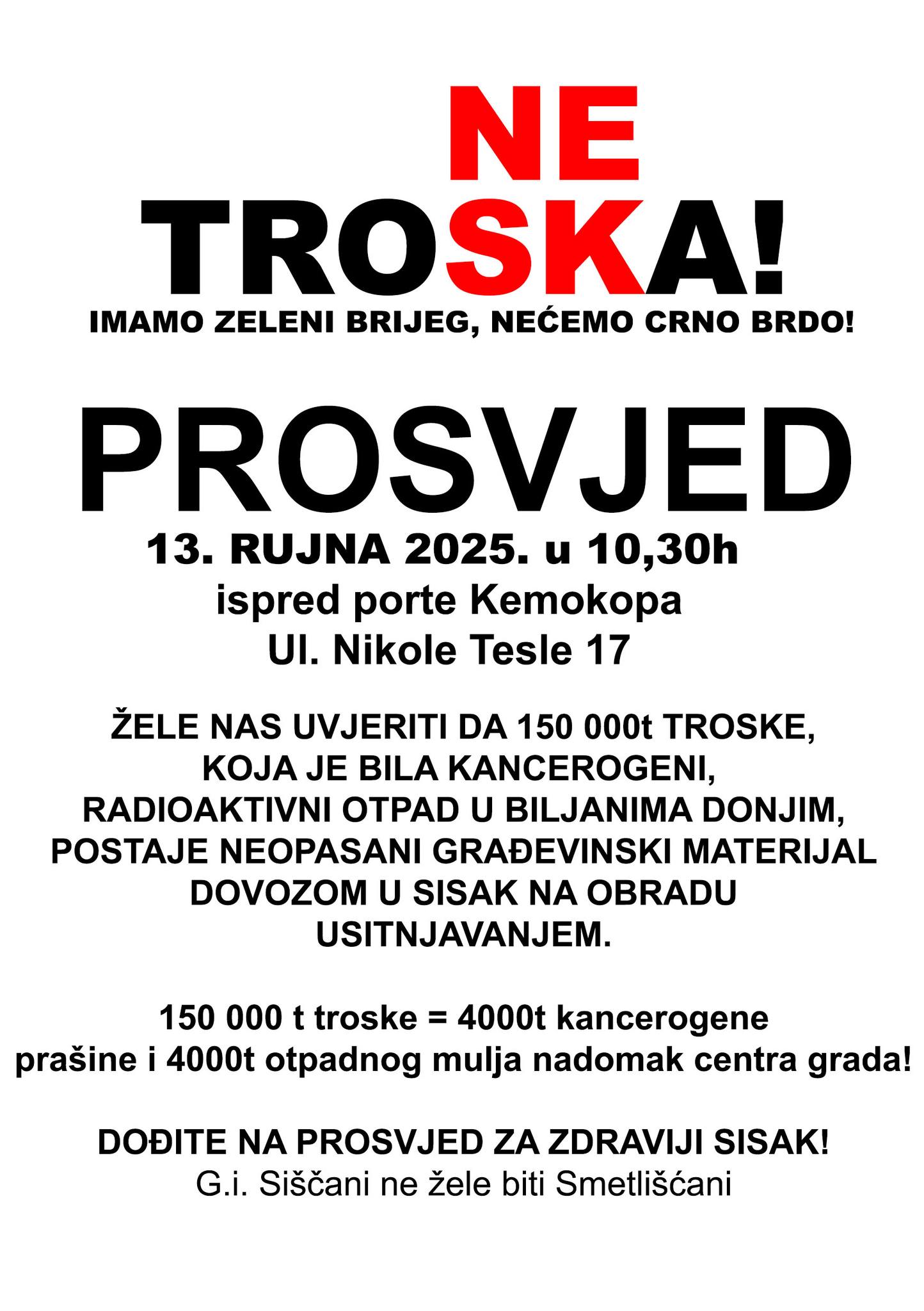 “O „Crnom brdu“ iz medija saznajemo da sadrži kancerogene elemente i spojeve te da je izmjerena radioaktivnost uzoraka bila iznad granica dozvoljenoga. U blizini lokacije s koje se troska dovozi, zabilježen je porast malignih oboljenja u stanovništvu. Lokacija na kojoj bi se u Sisku troska trebala obrađivati je prostor bivšeg Herbosa, danas Kemokop u ulici Nikole Tesle. Prostor, u kojemu djeluju Kemokop i njegovi podstanari, koji se bave obradom opasnog i neopasnog otpada raznih vrsta, smatramo krajnje neprikladnim za obavljanje takve djelatnosti zbog blizine gusto naseljenih dijelova grada. Prosvjed je radi navedenoga ujedno i prosvjed kojim tražimo izmještanje industrije otpada iz blizine centra grada. Svakodnevni smrad koji se i danju, a posebice noću širi iz tog prostora znatno narušava kvalitetu života građana, a bojimo se i posljedica po zdravlje.” – poručuju organizatori koji pozivaju građane da se okupe 13. rujna u 10,30 sati pred portom Kemokopa gdje će biti održan uvodni govor.